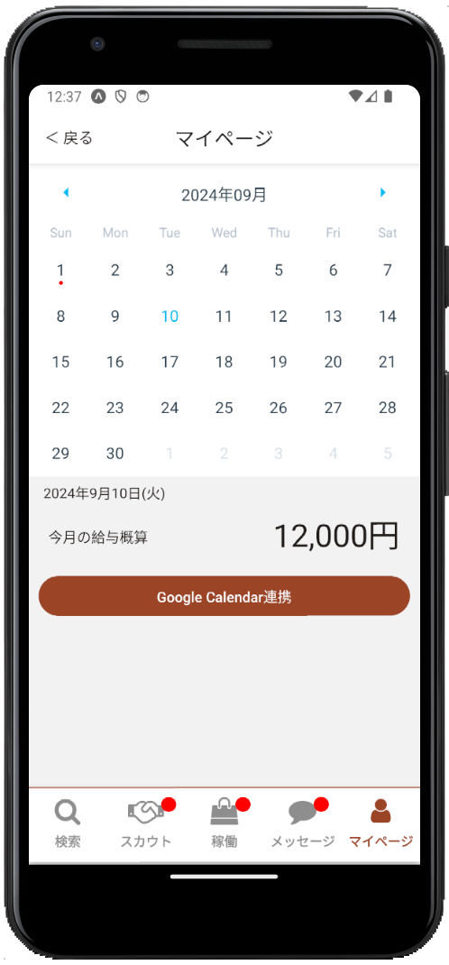 Google Calendarと連携することで、アプリ内で成立した 稼働以外のスケジュールも確認が可能!